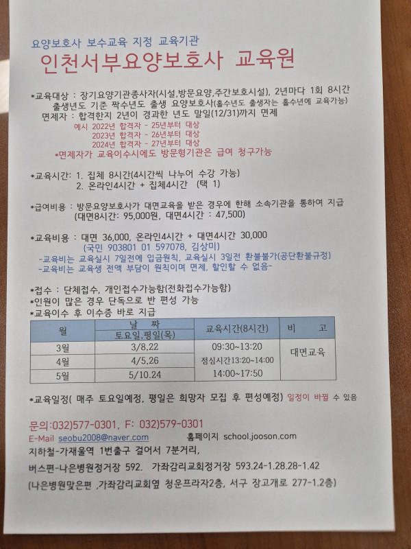 2025년 3월 4월 5월 보수교육 일정이 나왔습니다(5월17일을 추가했습니다~5/10,17,24일 예정입니다) 작성자 정보 깡미 작성 작성일 2025.02.18 17:58 컨텐츠 정보 2,974 조회 목록 본문 2025년 3월,4월,5월 보수 교육 일정이 나왔습니다매월 격 주 토요일 실시할 예정입니다평일을 원하시면 반을 따로 만들어 드릴 수 있습니다감사합니다~~~~ SNS 공유 관련자료 이전 컴퓨터 모의 시험장이 4층에서 2층으로 이사왔습니다 작성일 2025.02.18 18:07 다음 2025년 1월,2월 개강 계획 입니다 (주간반 1월13일, 2월 27일 야간반2월11일개강합니다) 작성일 2025.01.07 17:57 댓글 0 등록된 댓글이 없습니다. 로그인한 회원만 댓글 등록이 가능합니다. 목록